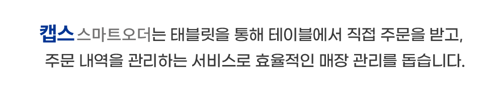 테이블에서 태블릿으로 주문을 받고, 그 주문 내역을 효율적으로 관리할 수 있는 ‘캡스 스마트오더’는 설치부터 사용, A/S까지 모든 과정을 확실하게 지원합니다.
