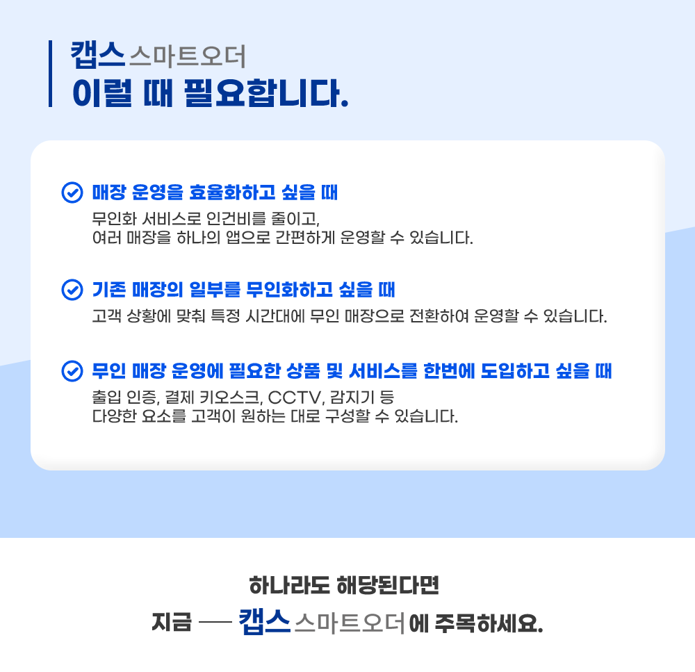 캡스 스마트오더와 함께라면 여러분의 매장을 보다 효율적으로 관리할 수 있습니다.무인매장 솔루션 ‘캡스 스마트오더’로 매장의가치를 한층 높여보세요!