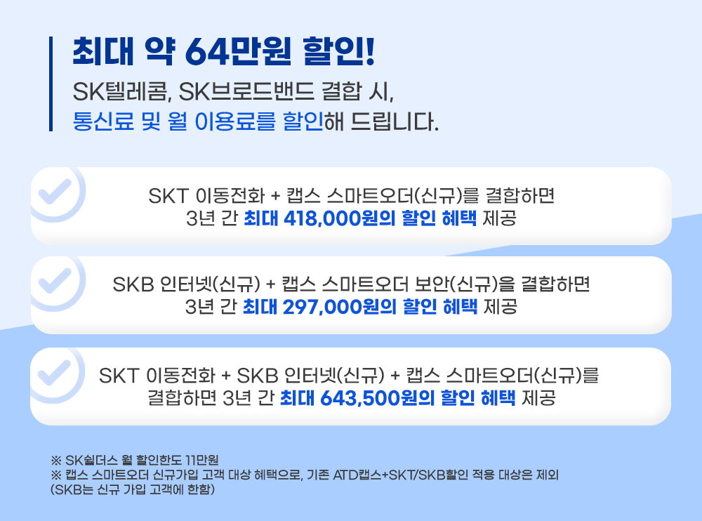 SK텔레콤 고객은 최대 418,000원, SK브로드밴드 신규 고객은 최대 297,000원의 할인 혜택을 받을 수 있습니다. 그리고 SK텔레콤 이동전화와 SK브로드밴드 인터넷, 캡스 스마트오더를 모두 결합하면 무려 최대 643,500원의 할인 혜택을 받을 수 있습니다. 캡스 스마트오더의 신규 가입 고객을 대상으로 적용되며, SK브로드밴드 할인의 경우 신규 가입 고객에 한해서만 적용됩니다.